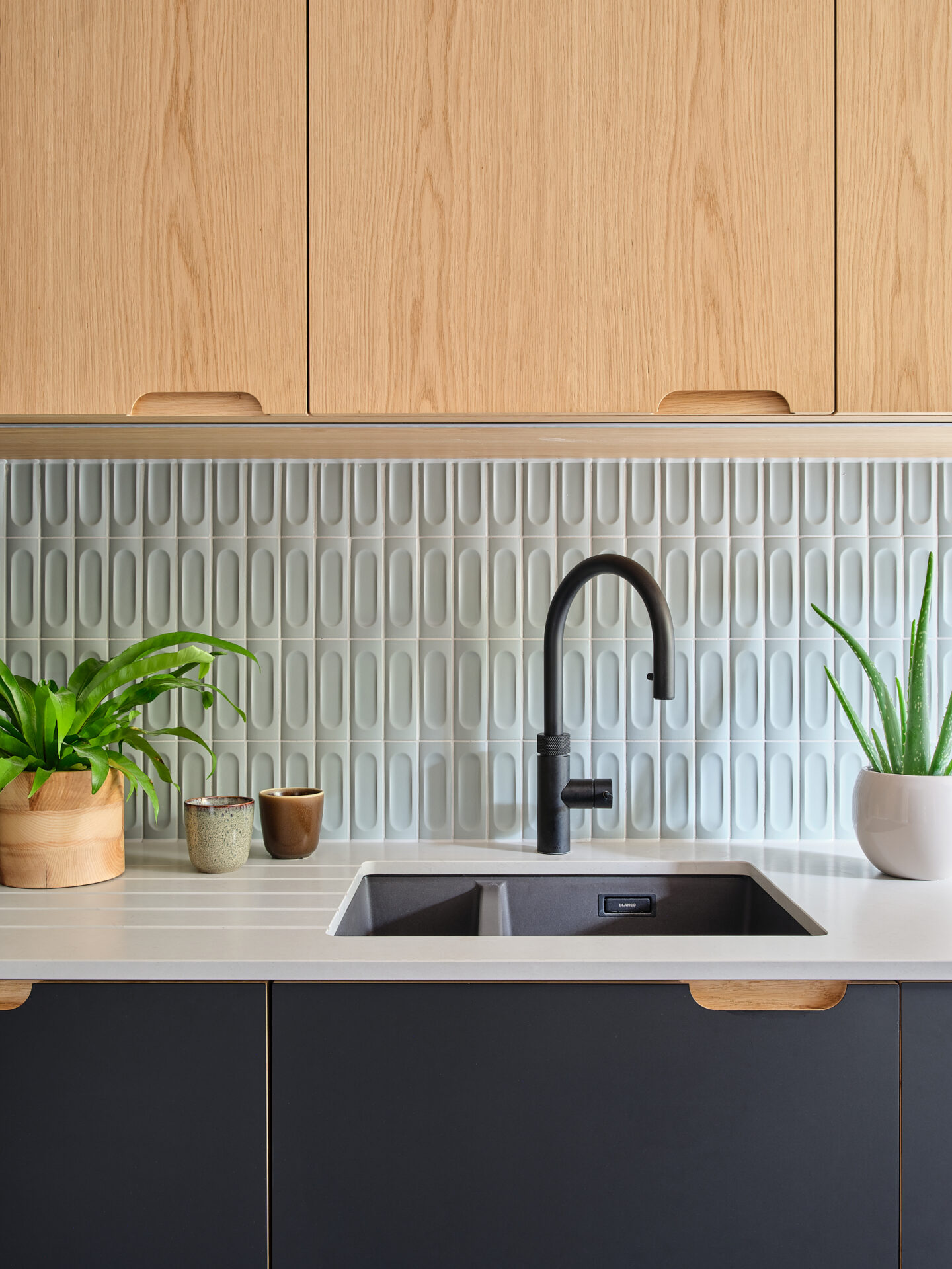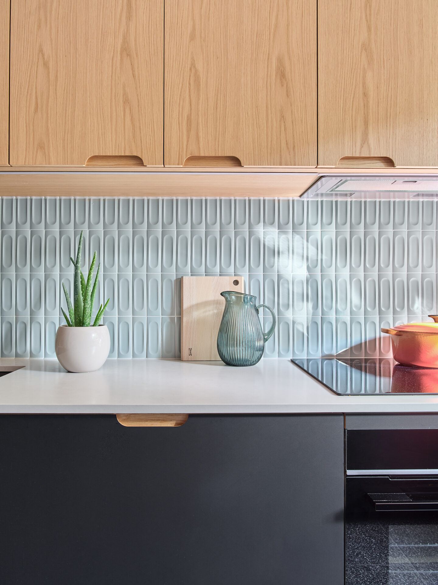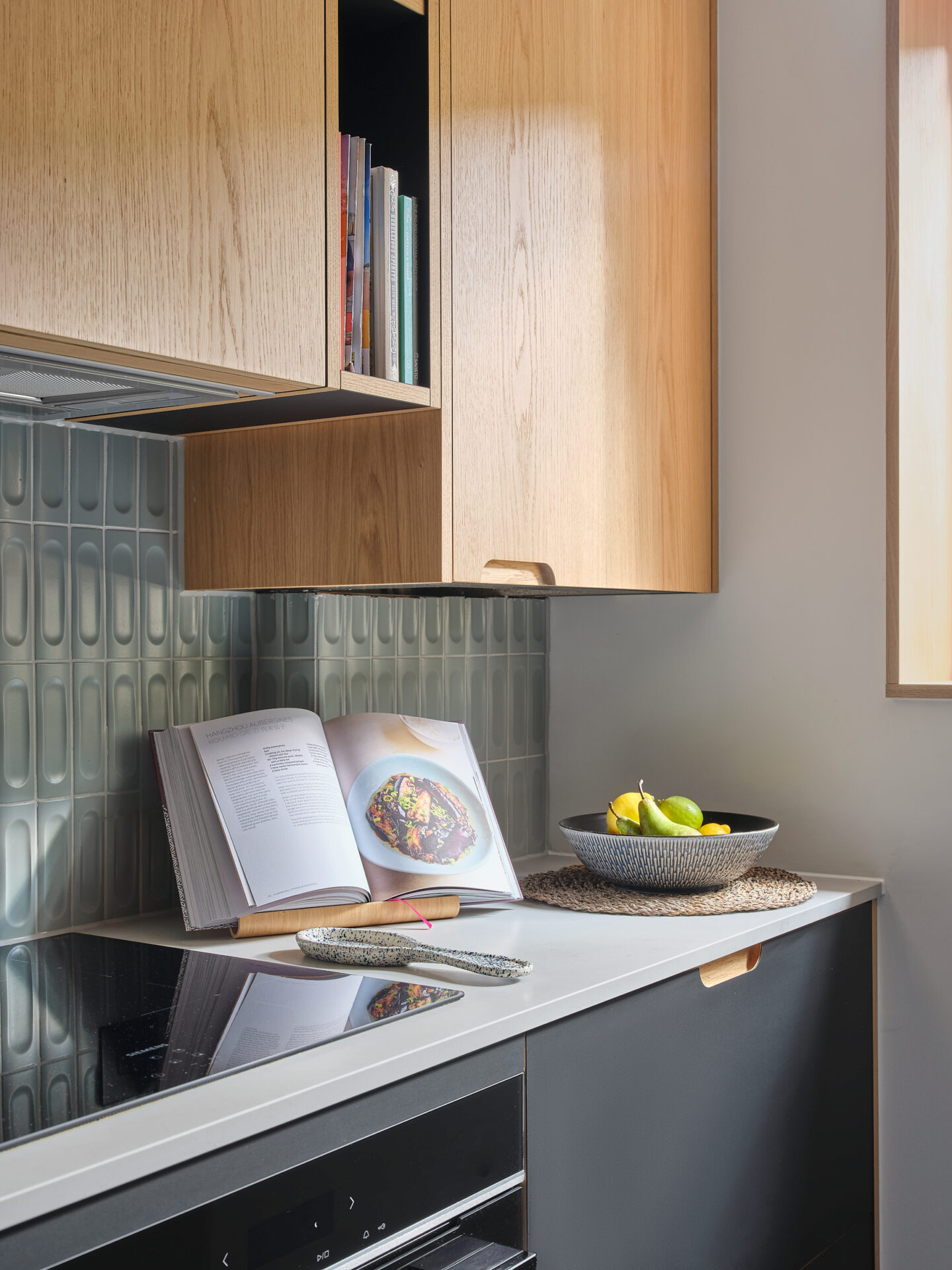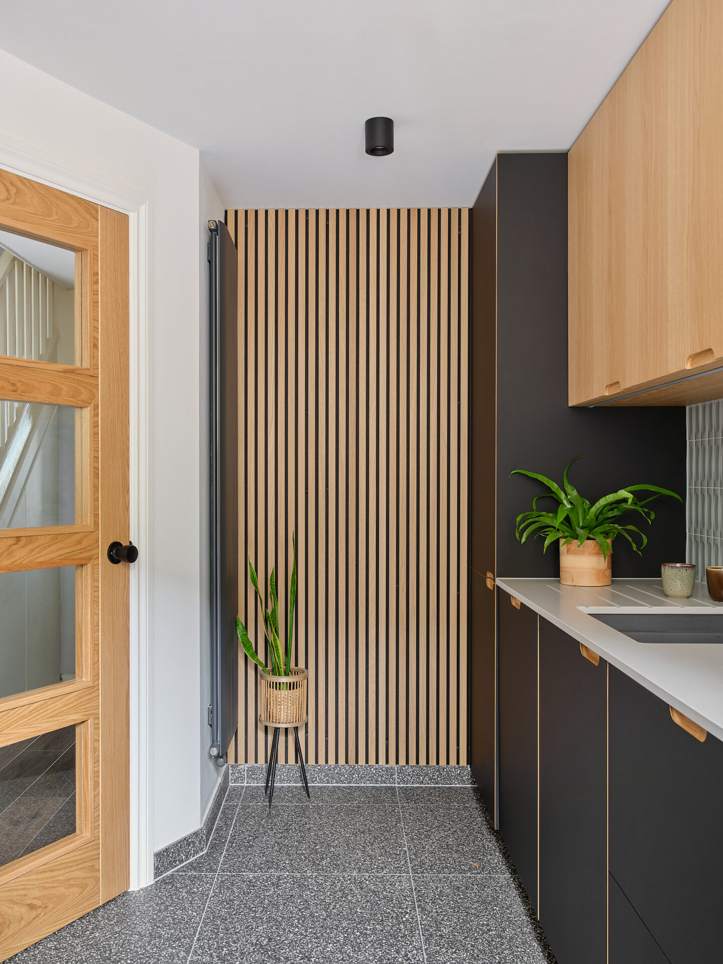 A rich palette of texture was chosen here including real oak veneer and fenix fronts, textured tiles for movement, and a dark tiled floor.