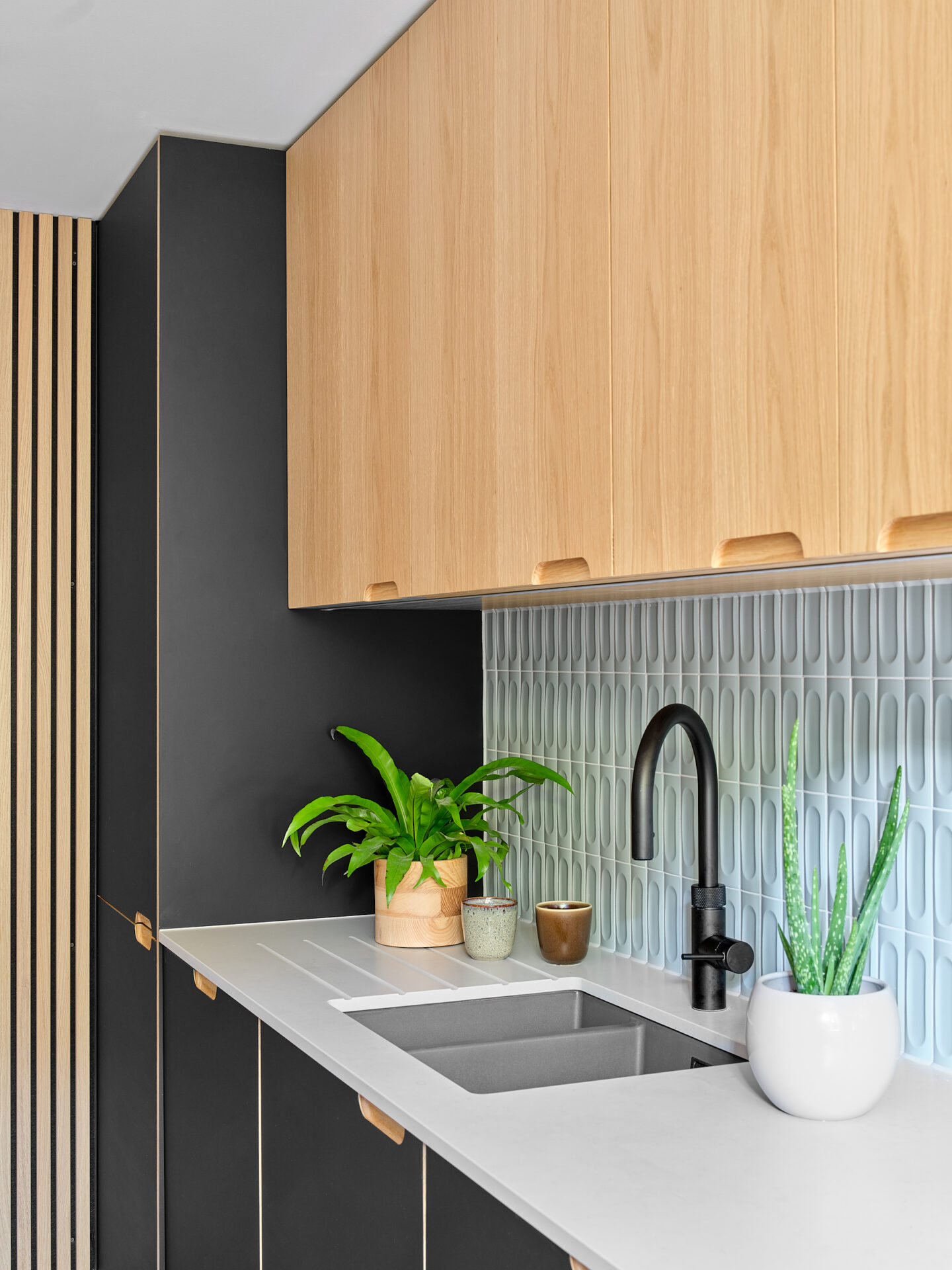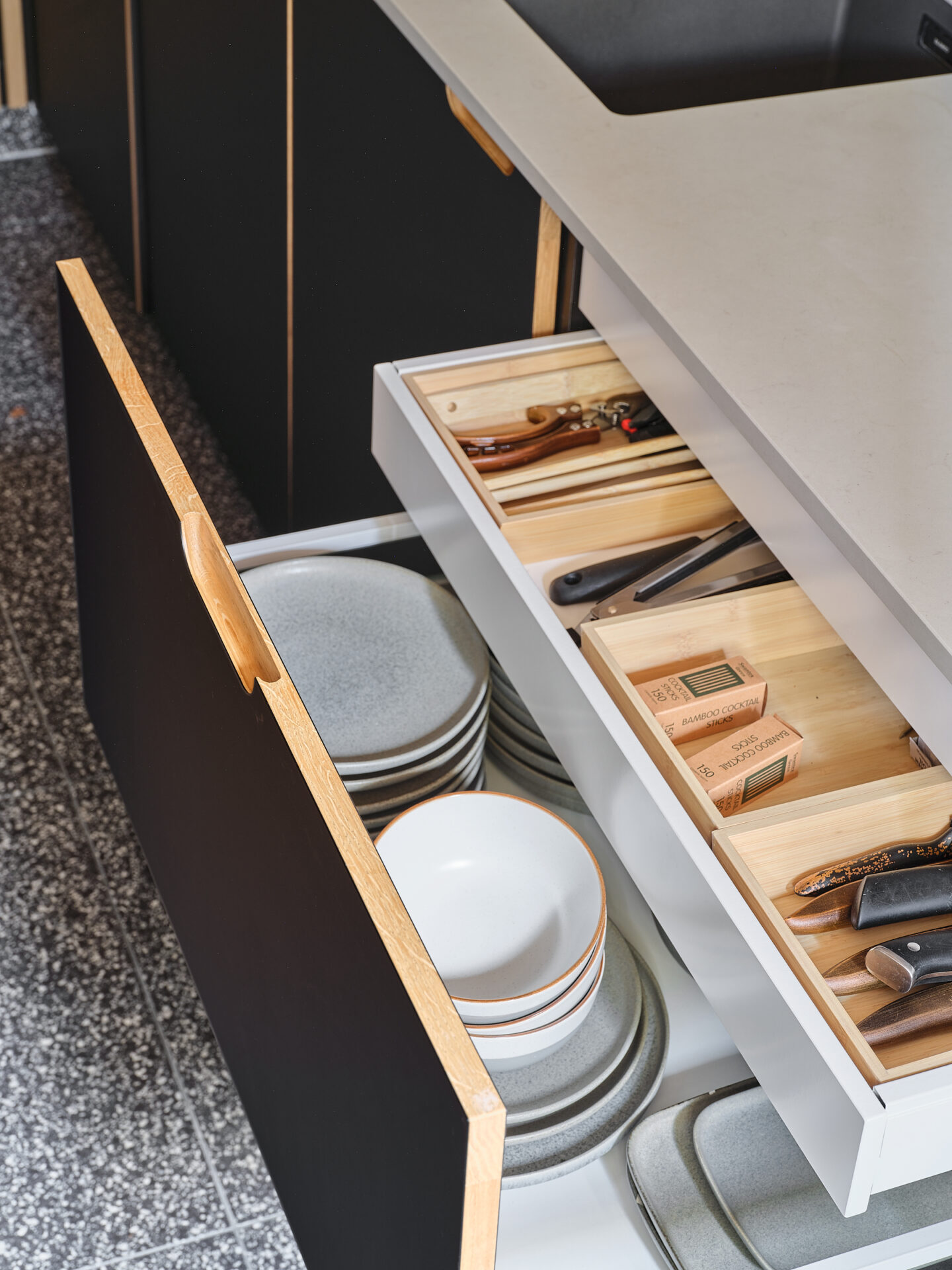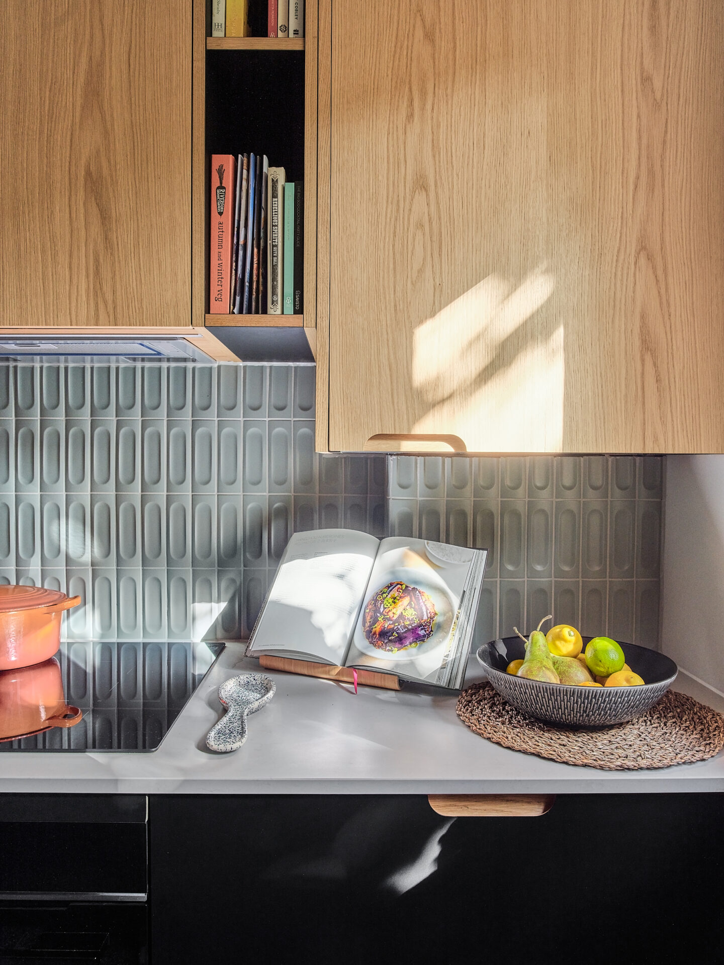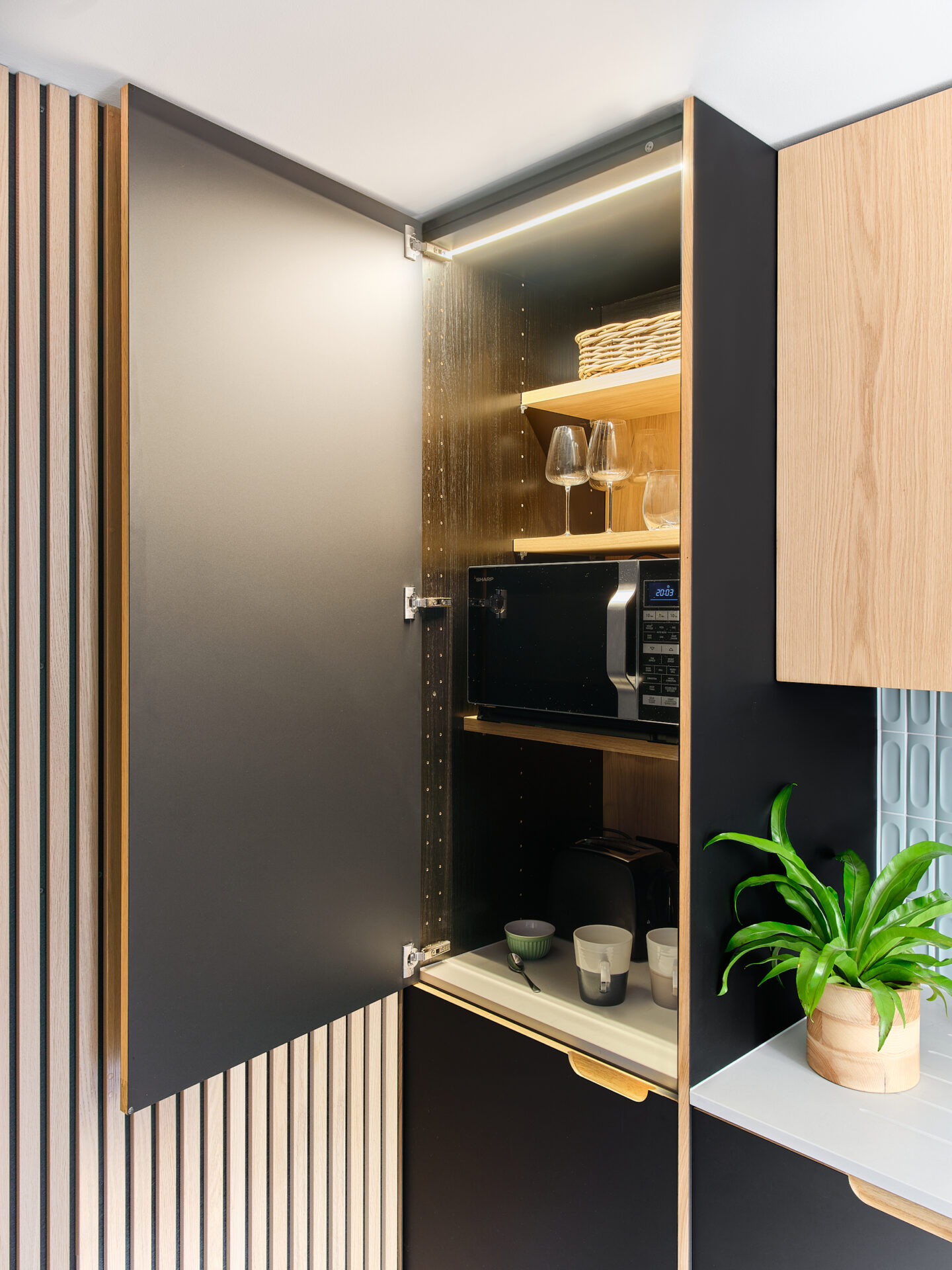 A rich palette of texture was chosen here including real oak veneer and fenix fronts, textured tiles for movement, and a dark tiled floor.