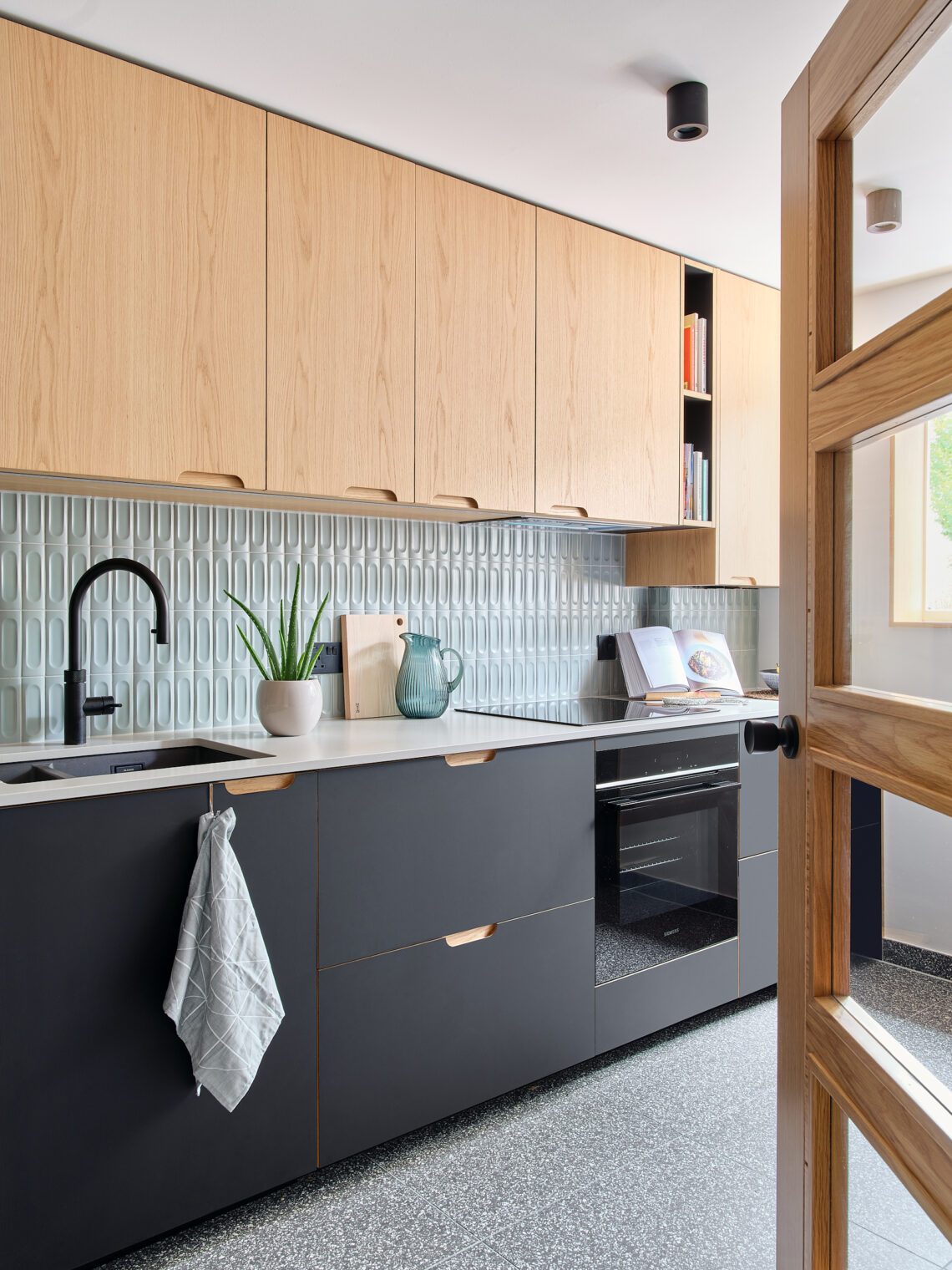 A rich palette of texture was chosen here including real oak veneer and fenix fronts, textured tiles for movement, and a dark tiled floor.