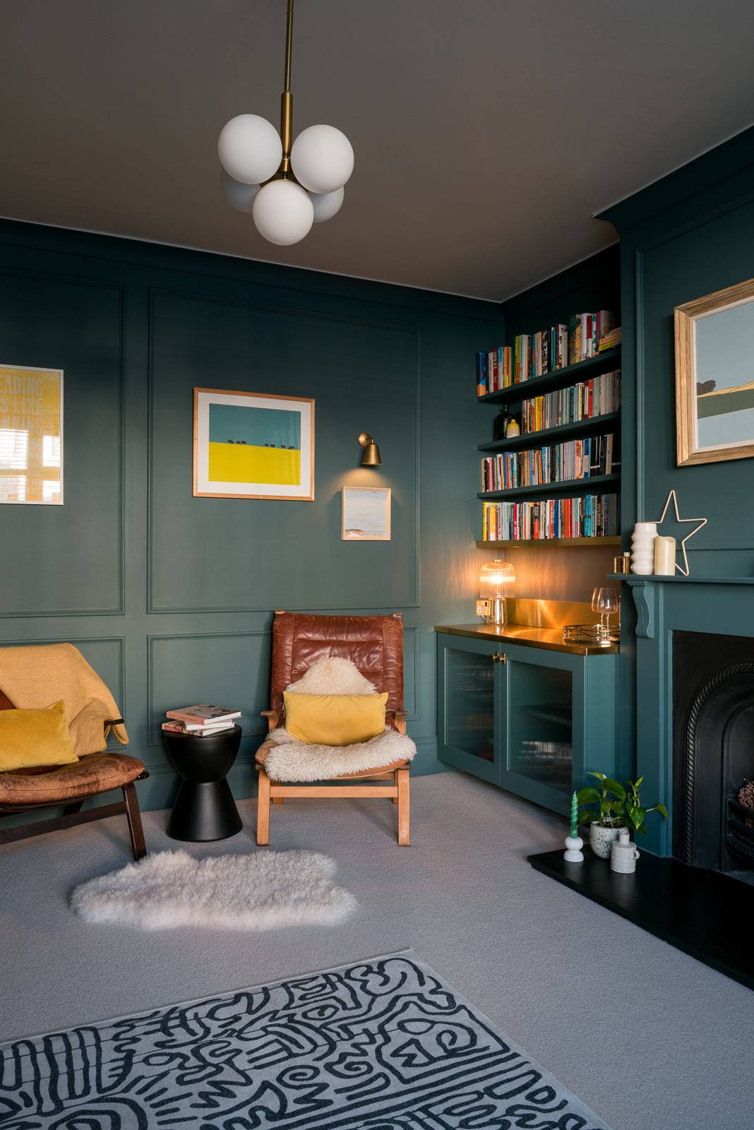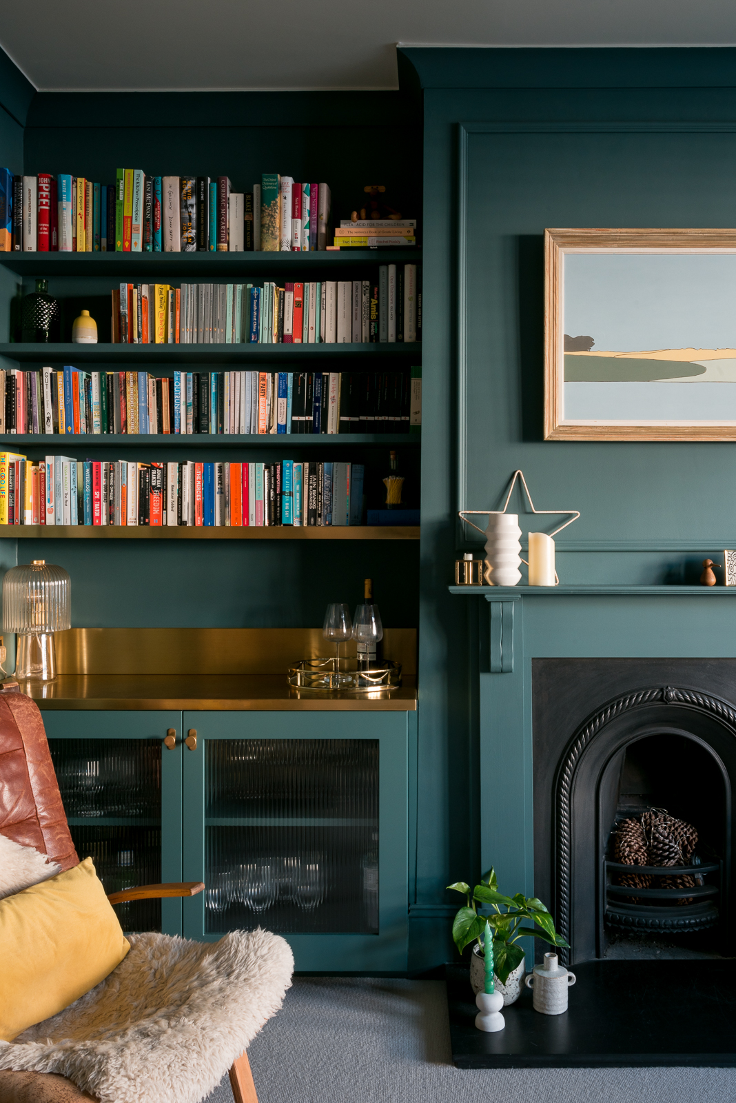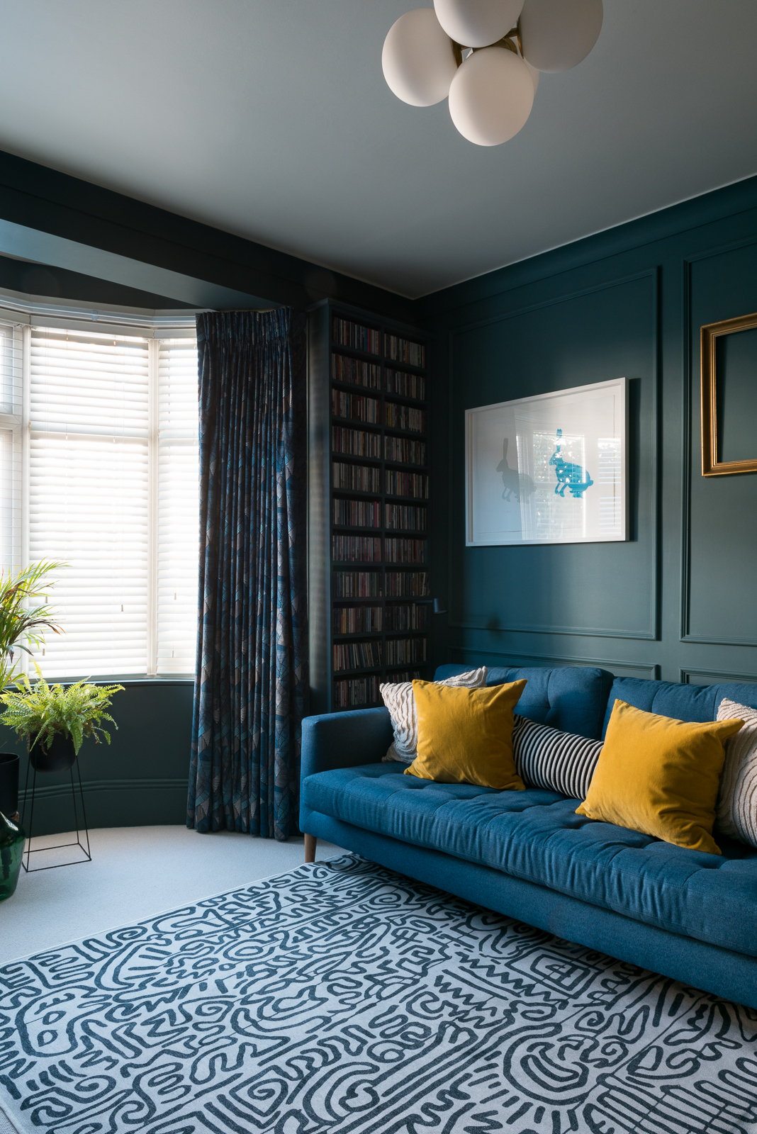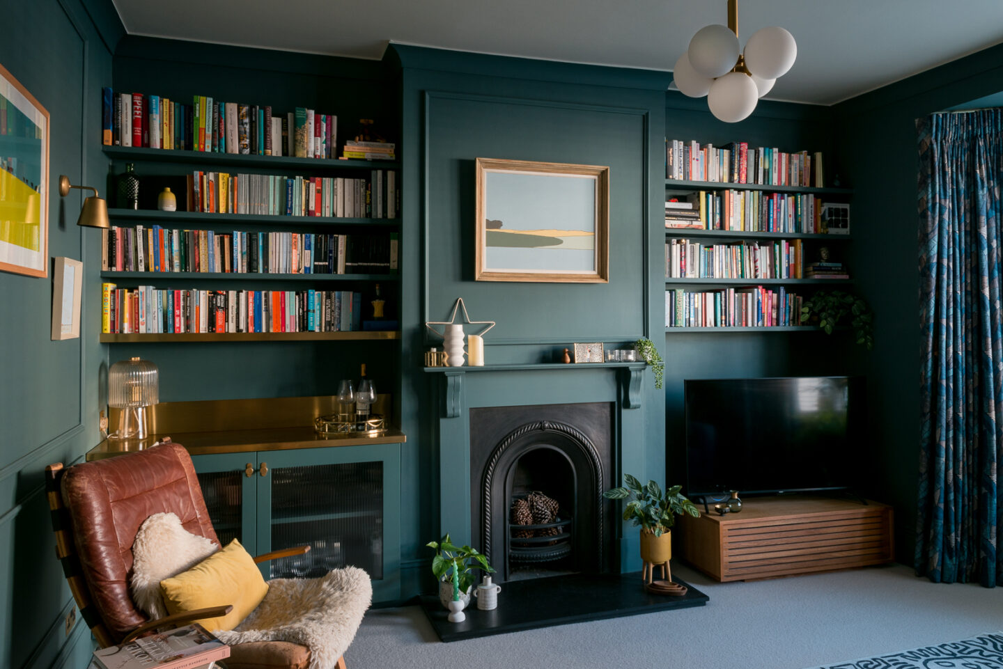 Previously this room was very white and I decided on dark tones to embrace the north facing aspect to tie in with the artwork on the fireplace. A beautiful bespoke statement bar was designed for one of the alcoves with a brass top and bespoke moulded panelling placed all the way around the room. Last of all striking full length curtains line the large bay window working seamlessly with the wall colour adding a little piece of luxury to the space.