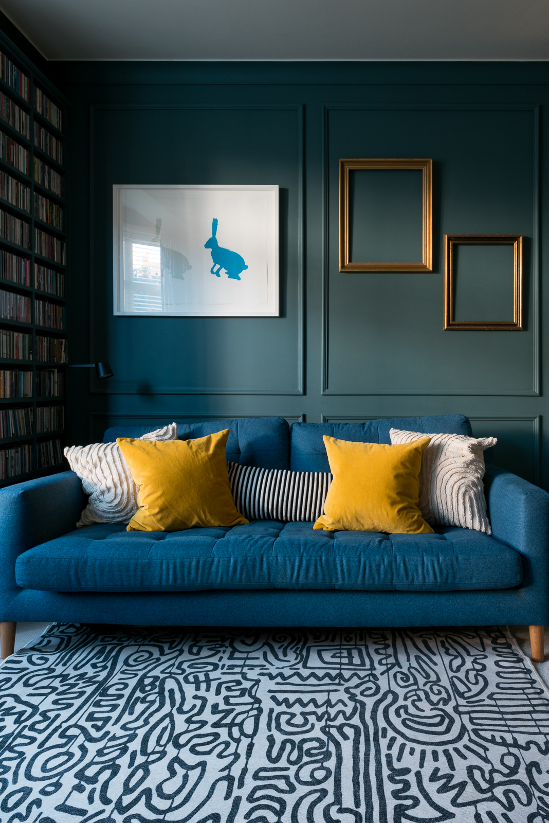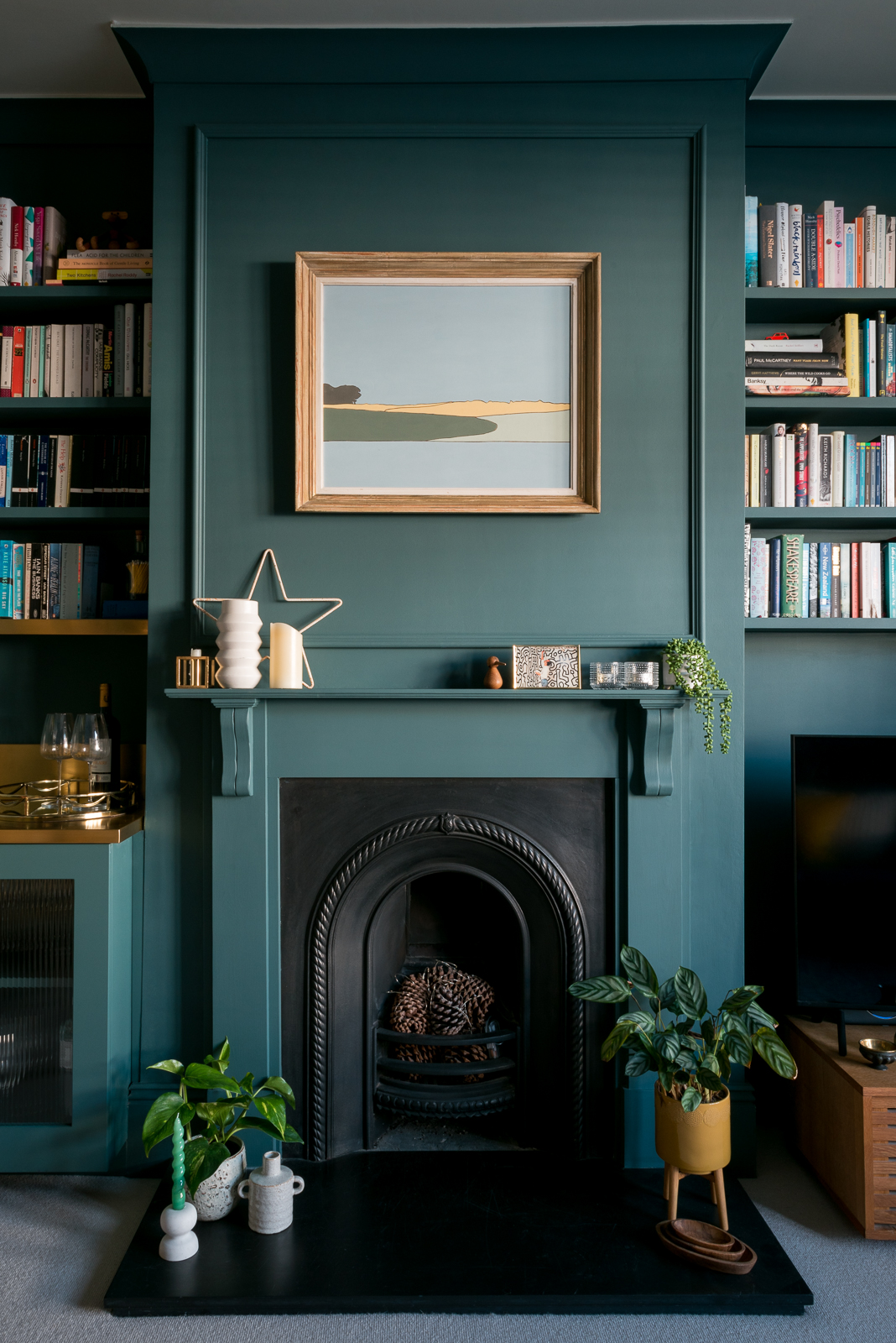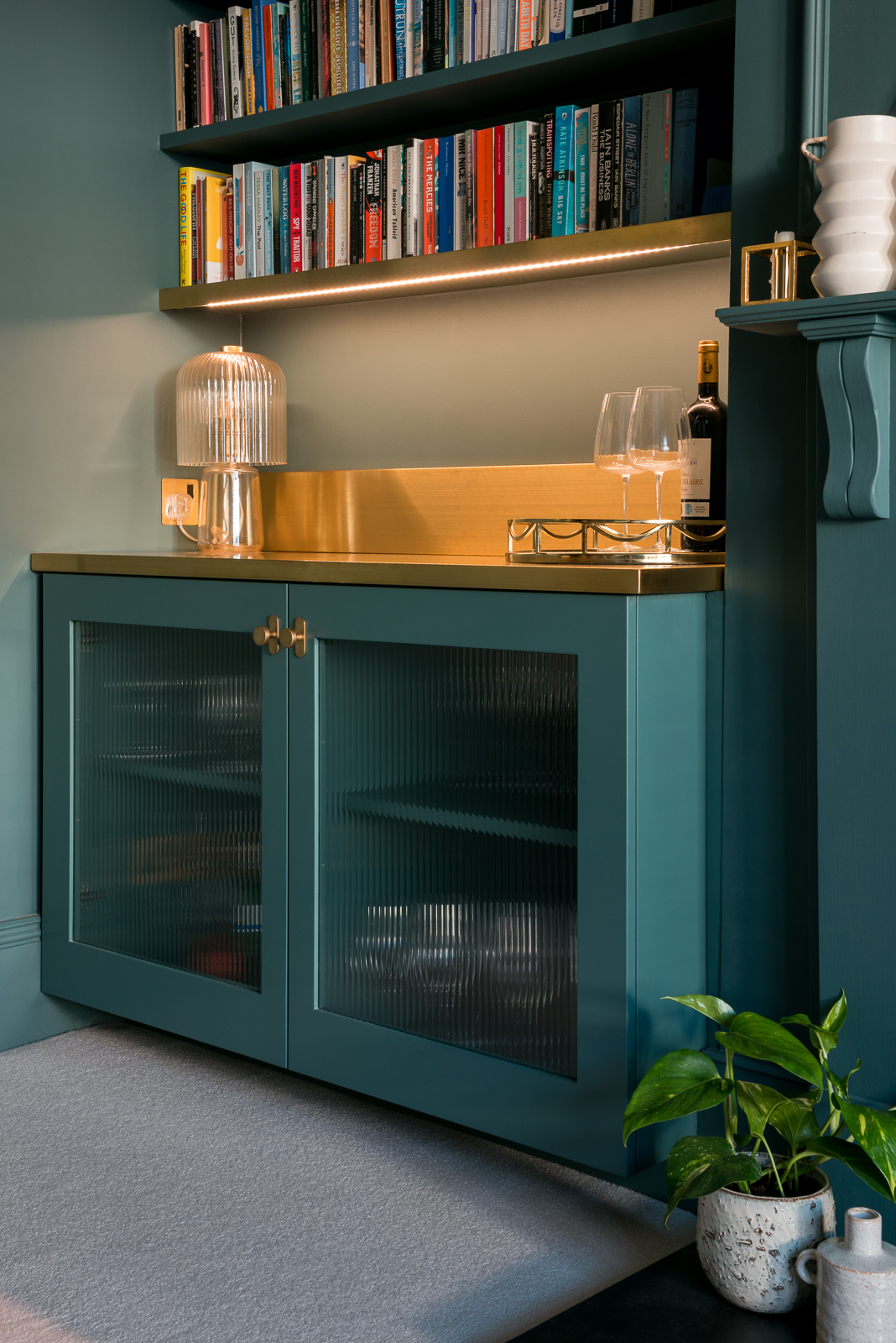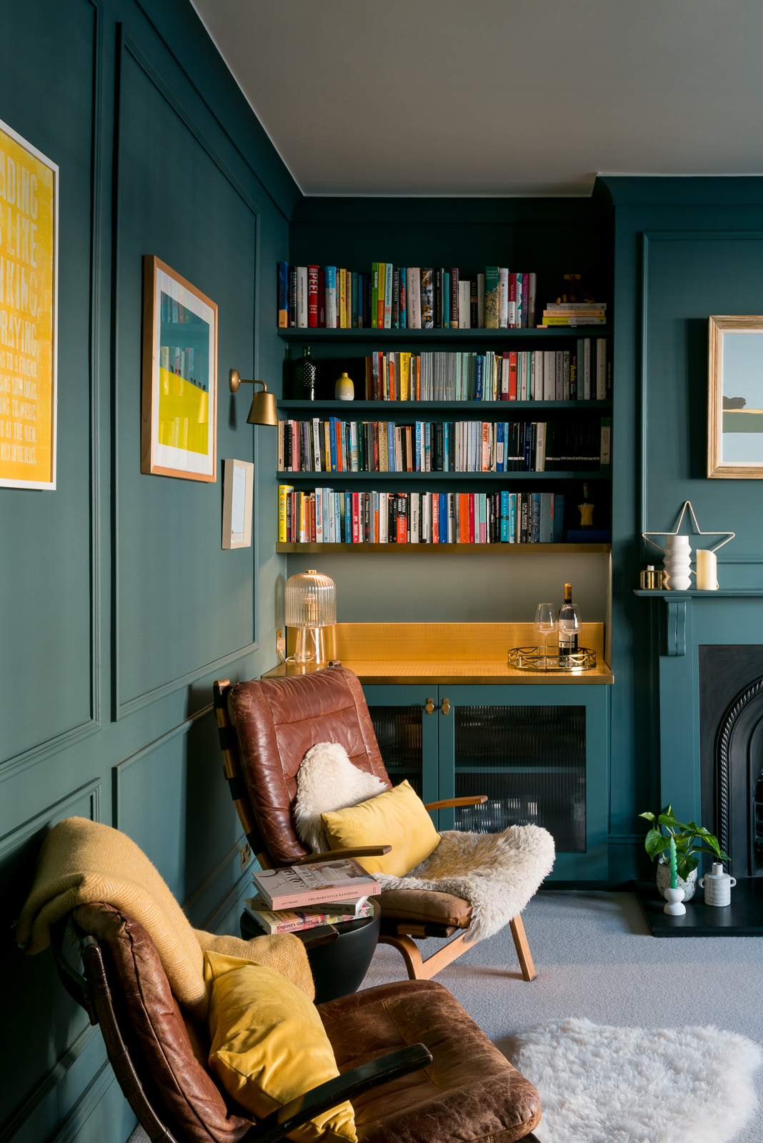 Previously this room was very white and I decided on dark tones to embrace the north facing aspect to tie in with the artwork on the fireplace. A beautiful bespoke statement bar was designed for one of the alcoves with a brass top and bespoke moulded panelling placed all the way around the room. Last of all striking full length curtains line the large bay window working seamlessly with the wall colour adding a little piece of luxury to the space.